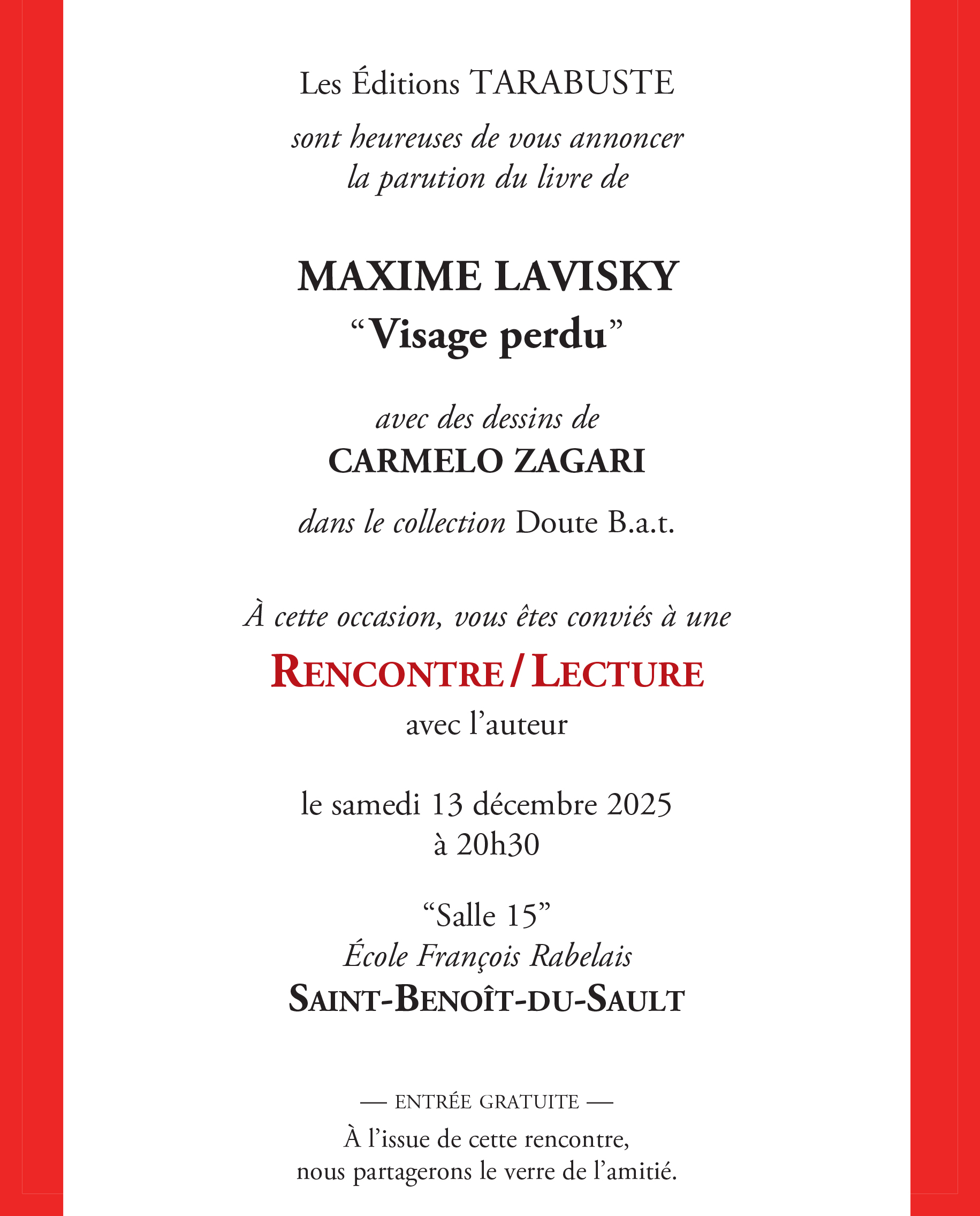 Rencontre / Lecture avec l'auteur le samedi 13 décembre à 20h30 à Saint-Benoît-du-Sault ("Salle 15" - Ecole François Rabelais)